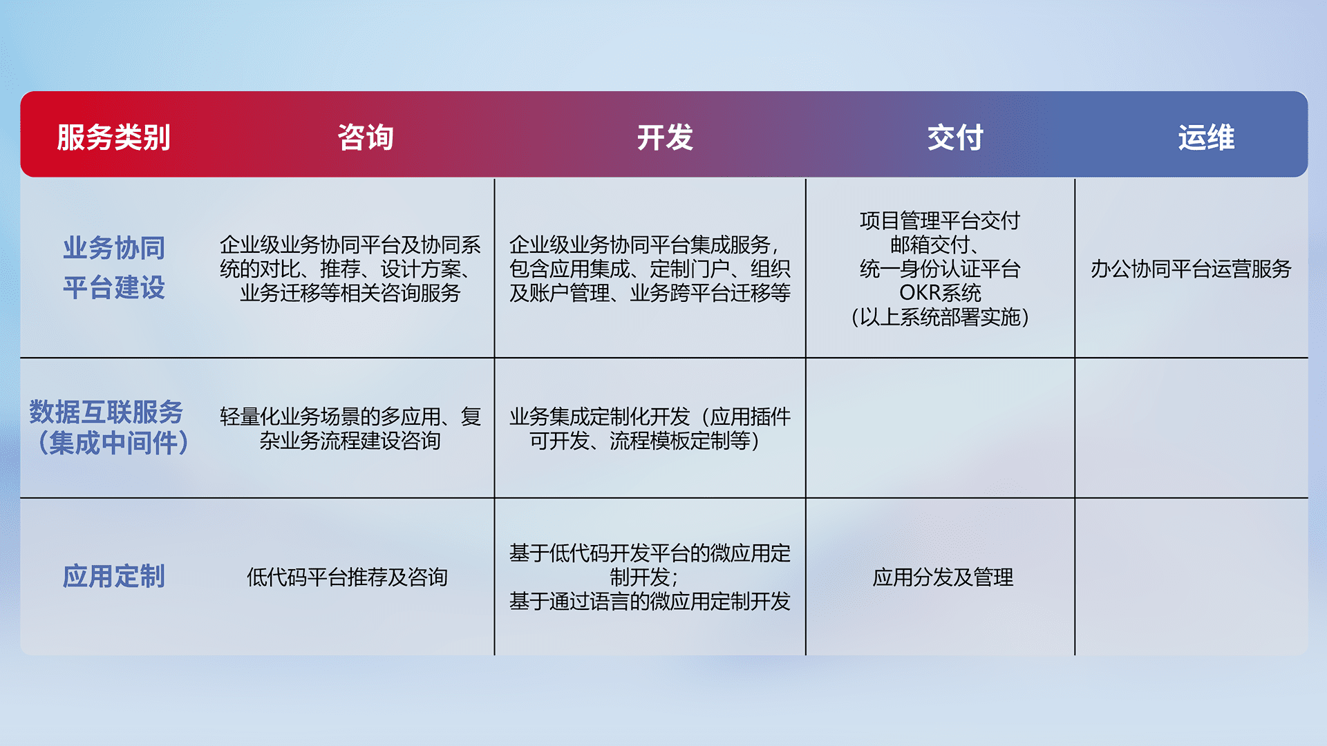 针对钉钉、、企微、、、IDaas等平台级产品提供产品的规划、、方案、、交付、、、定制化开发等服务,,实现如统一协同办公、、、智能客户服务、、、、混合会议管理、、、、智能数据查询、、、、等业务场景,,,实现数字化转型。。。